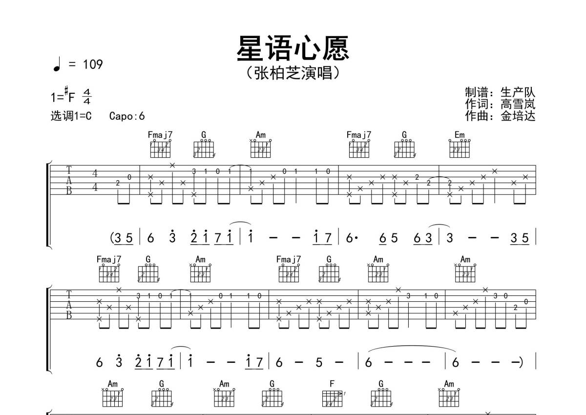 《星语心愿》是张柏芝演唱的一首歌曲,精编完美版,歌曲速度为每分钟109拍,歌曲原调为Gb调,但由于原调指法比较难,为了方便弹奏,本吉他谱采用的是C调指法编配,变调夹6品弹奏即为原调,当然也可以根据自己的音域改变变调夹位置,或者通过改变和弦调性,以方便自己弹奏,这份吉他谱共有两张高清图谱,图谱由 @生产队 编配上传,图谱使用六线谱编配,包含吉他和弦指法、简谱以及歌词部分,使用这份星语心愿吉他谱,可以让你更加方便地掌握这首歌曲的弹唱技巧,快来尝试吧。《星语星愿》是张柏芝演唱的一首歌曲,该曲也是电影《星语星愿》的主题曲 ,本吉他谱根据原版采用C调指法编配,精准的前奏、间奏、尾奏编配,值得推荐的怀旧歌曲!。