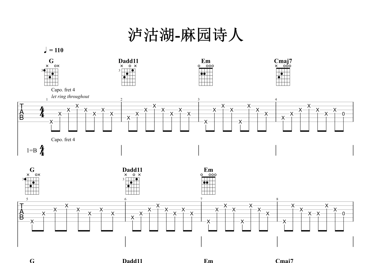 《泸沽湖》是麻园诗人演唱的一首歌曲,石头音乐原版记谱,拍号为4/4拍,歌曲速度为每分钟110拍,歌曲原调为B调,但由于原调指法比较难,为了方便弹奏,本吉他谱采用的是G调指法编配,变调夹4品弹奏即为原调,当然也可以根据自己的音域改变变调夹位置,或者通过改变和弦调性,以方便自己弹奏,这份吉他谱共有四张高清图谱,图谱由 @石头音乐 编配上传,图谱使用六线谱编配,包含吉他和弦指法、简谱以及歌词部分,曲谱配备了相关的音频提供试听,使用这份泸沽湖吉他谱,可以让你更加方便地掌握这首歌曲的弹唱技巧,快来尝试吧。