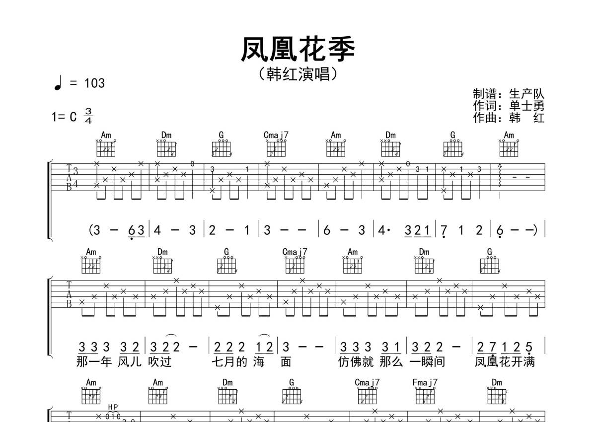 《凤凰花季》是韩红演唱的一首歌曲,精编完美版,拍号为3/4拍,歌曲速度为每分钟103拍,歌曲原调为C调,本吉他谱采用的是C调指法编配,演奏时不需要使用变调夹即为原调,这份吉他谱共有三张高清图谱,图谱由 @生产队 编配上传,图谱使用六线谱编配,包含吉他和弦指法、简谱以及歌词部分,使用这份凤凰花季吉他谱,可以让你更加方便地掌握这首歌曲的弹唱技巧,快来尝试吧。《凤凰花季》是韩红演唱的歌曲,由单士勇、兰红作词,高飞作曲,收录于《凤凰花季》专辑中。本吉他谱根据C调指法编配,精准的前奏、间奏、尾奏和SOLO编配,一首温暖而动人的歌曲,值得推荐学习!。