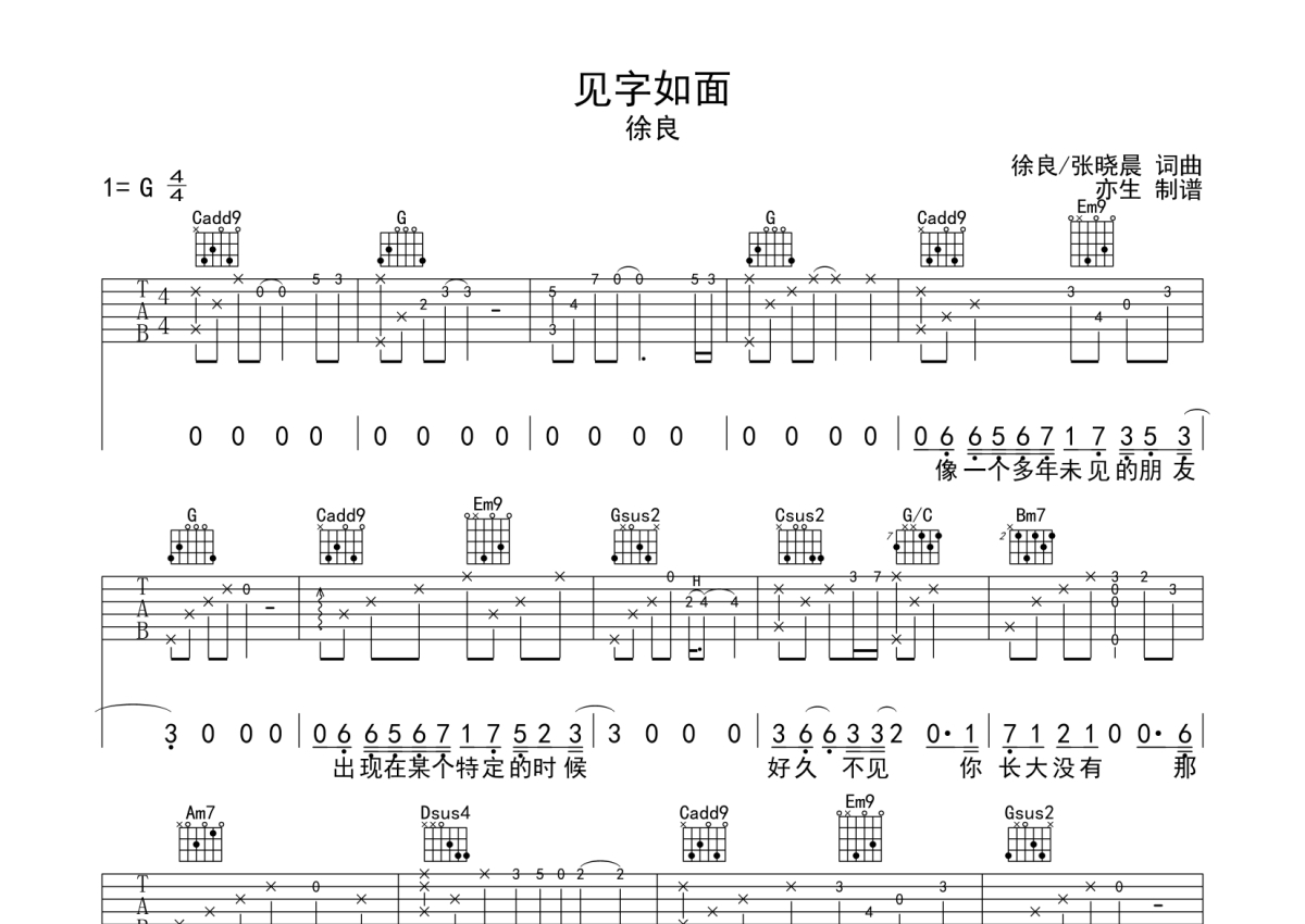 徐良《见字如面》吉他谱 - G调弹唱六线谱