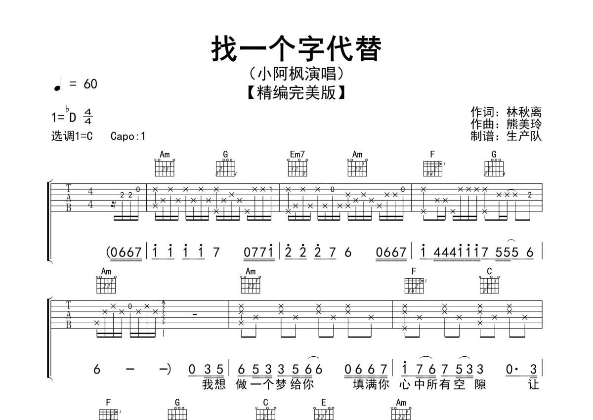 《找一个字代替》是小阿枫演唱的一首歌曲,精编完美版,拍号为4/4拍,歌曲速度为每分钟60拍,歌曲原调为Db调,但由于原调指法比较难,为了方便弹奏,本吉他谱采用的是C调指法编配,变调夹1品弹奏即为原调,当然也可以根据自己的音域改变变调夹位置,或者通过改变和弦调性,以方便自己弹奏,这份吉他谱共有三张高清图谱,图谱由 @生产队 编配上传,图谱使用六线谱编配,包含吉他和弦指法、简谱以及歌词部分,使用这份找一个字代替吉他谱,可以让你更加方便地掌握这首歌曲的弹唱技巧,快来尝试吧。《找一个字代替》本吉他谱是根据小阿枫翻唱的版本采用C调指法原版编配,完整的前奏、间奏编配,值得推荐回味的怀旧经典歌曲!。