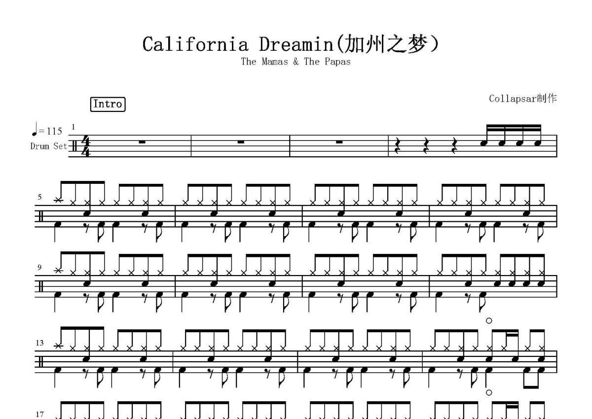 《California Dreamin》是The Mamas & the Papas演唱的一首歌曲,这份鼓谱共有两张高清图谱,图谱由 @打鼓谱 编配上传,图谱使用五线谱编配,使用这份California Dreamin架子鼓谱,你将能够轻松地敲打出这首The Mamas & the Papas的California Dreamin,快来尝试吧。《California Dreamin'》这首歌曲。这个声音就是来自于The Mamas & the Papas。通俗的曲式,唯美的人声,这是the Mamas & the Papas乐队给你的一个率意的黎明,在那片走不出的重庆森林里,有一个姑娘也曾经和我们一起为梦中的加洲手舞足蹈。1964年,乐队在加州成立。当时的成员为John Phillips和妻子Michelle、Cass Elliott、Denny Doherty。1965年,乐队受雇于Dunhill唱片公司,负责给公司旗下艺人伴唱。有感於该乐队。