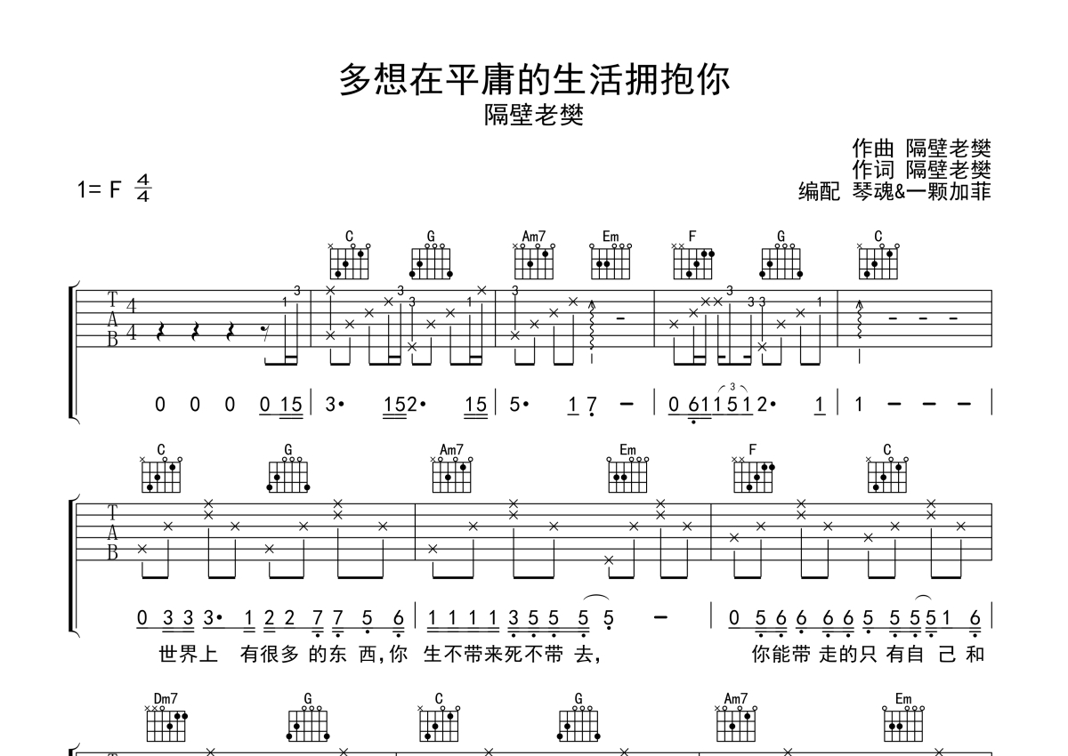 隔壁老樊《多想在平庸的生活拥抱你》吉他谱 - C调弹唱六线谱