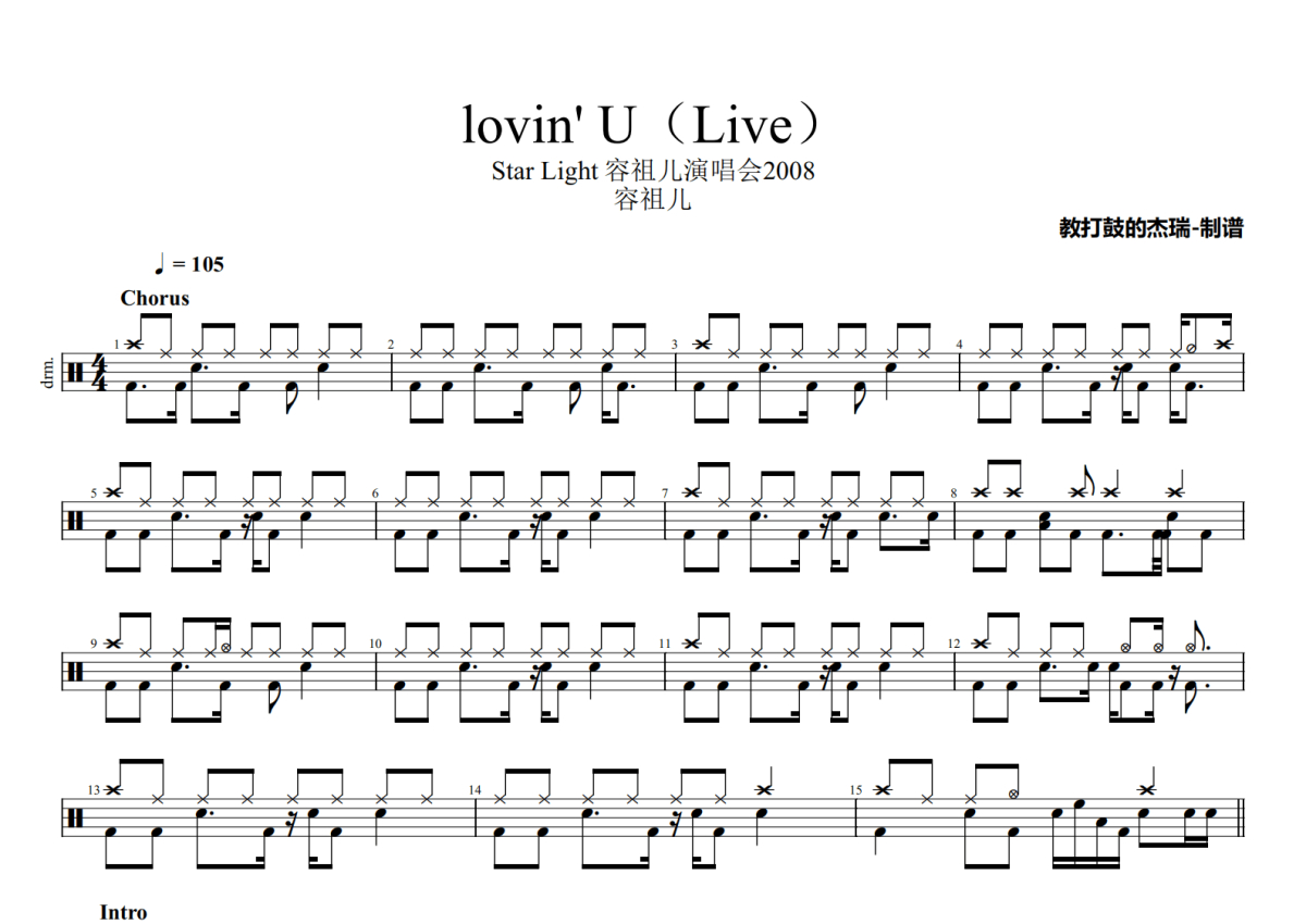 《lovin' U(Live)》是容祖儿演唱的一首歌曲,Star Light 容祖儿演唱会2008,这份鼓谱共有三张高清图谱,图谱由 @Jerry 编配上传,图谱使用五线谱编配,使用这份lovin' U(Live)架子鼓谱,你将能够轻松地敲打出这首容祖儿的lovin' U(Live),快来尝试吧。lovin' U(Live)。