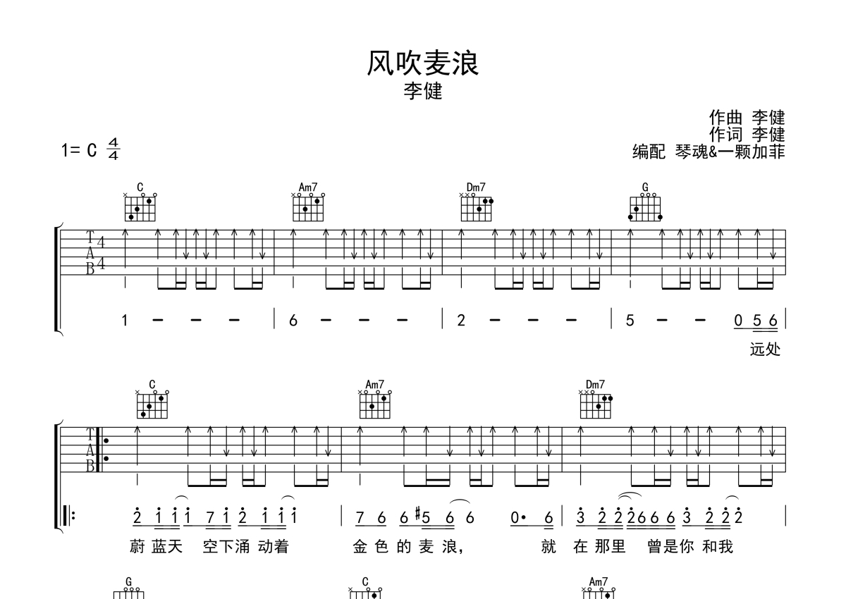 李健《风吹麦浪》吉他谱 - C调弹唱六线谱 - 扫弦版
