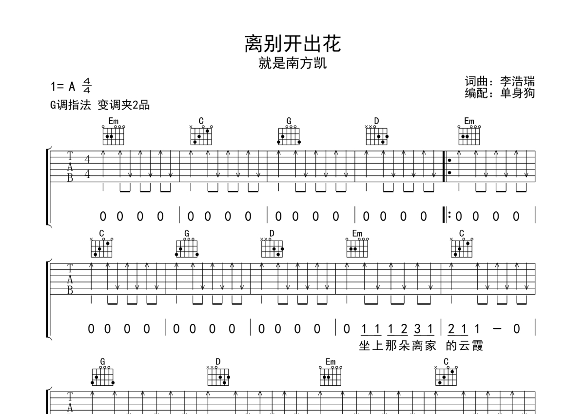 就是南方凯《离别开出花》吉他谱 - G调弹唱六线谱