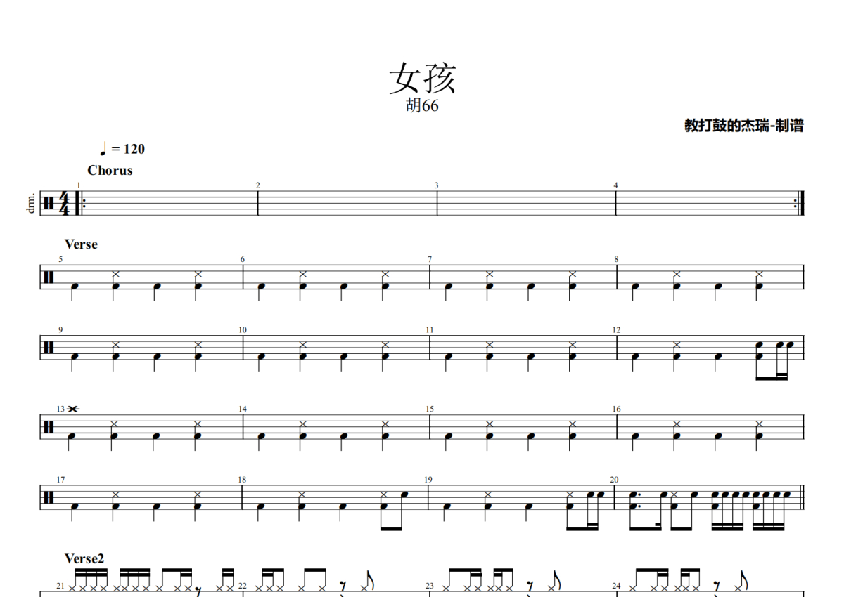 胡66《女孩》鼓谱 - 架子鼓谱