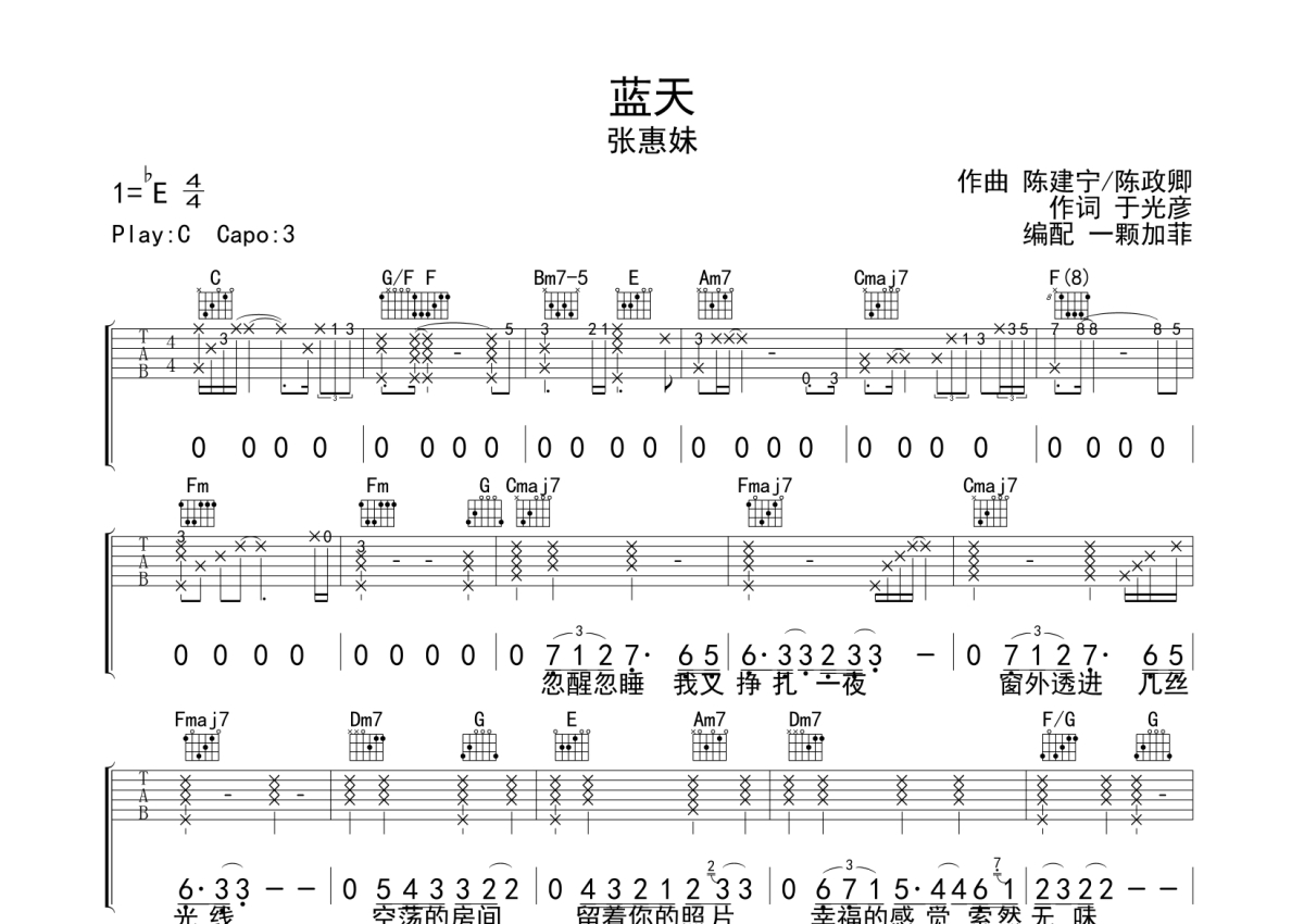 《蓝天》是张惠妹演唱的一首歌曲,拍号为4/4拍,歌曲原调为Eb调,但由于原调指法比较难,为了方便弹奏,本吉他谱采用的是C调指法编配,变调夹3品弹奏即为原调,当然也可以根据自己的音域改变变调夹位置,或者通过改变和弦调性,以方便自己弹奏,这份吉他谱共有两张高清图谱,图谱由 @一颗加菲 编配上传,图谱使用六线谱编配,包含吉他和弦指法、简谱以及歌词部分,曲谱配备了相关的音频提供试听,使用这份蓝天吉他谱,可以让你更加方便地掌握这首歌曲的弹唱技巧,快来尝试吧。