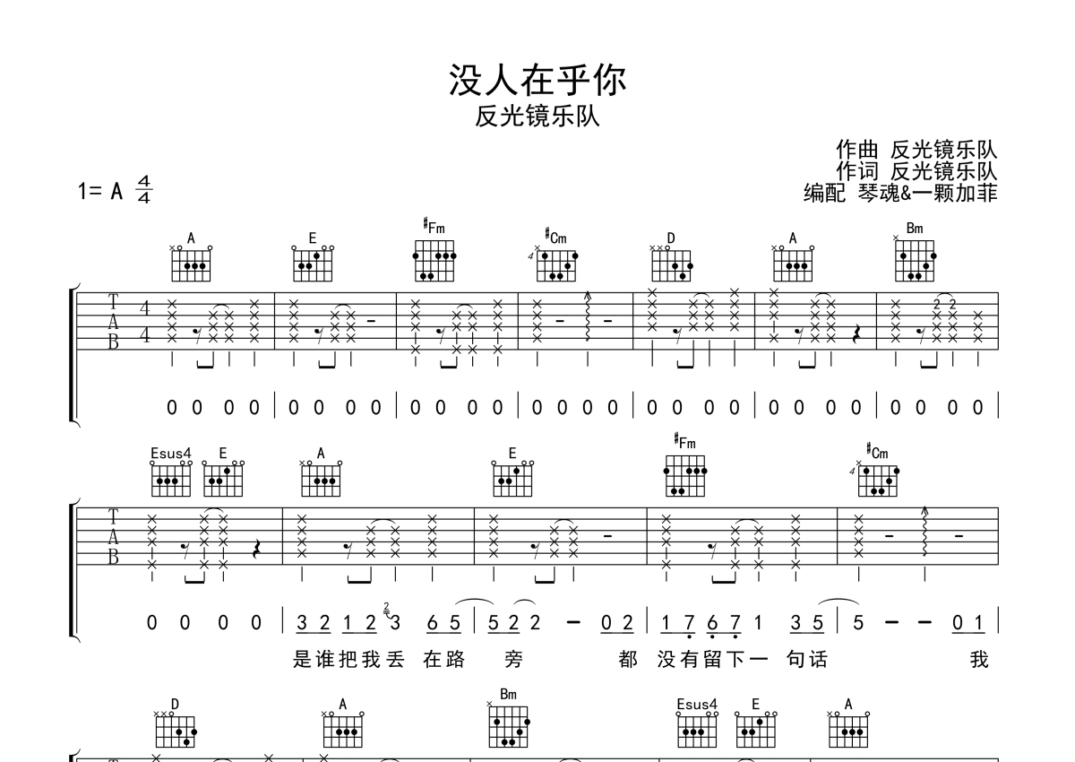 反光镜乐队《没人在乎你》吉他谱 - A调弹唱六线谱