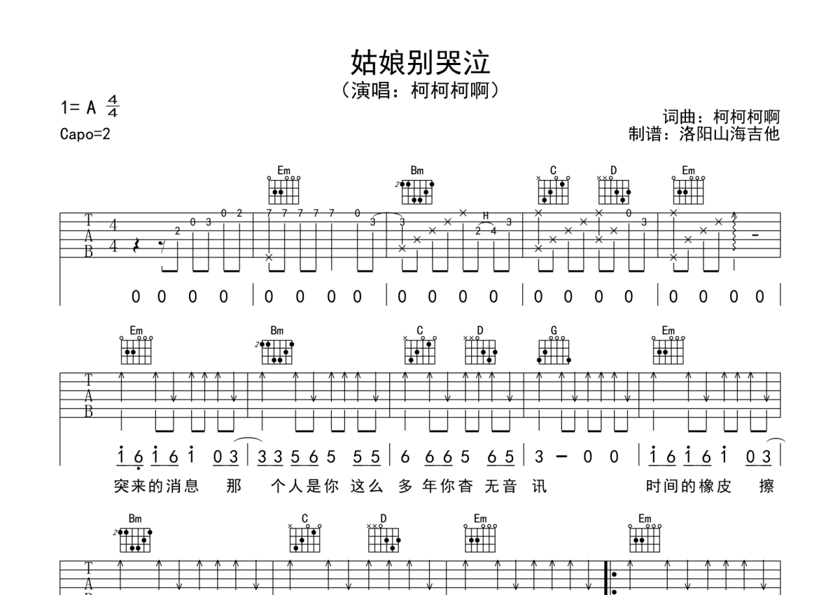 柯柯柯啊《姑娘别哭泣》吉他谱 - G调弹唱六线谱