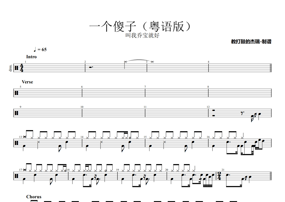 叫我乔宝就好《一个傻子》鼓谱 - 架子鼓谱 - 粤语版