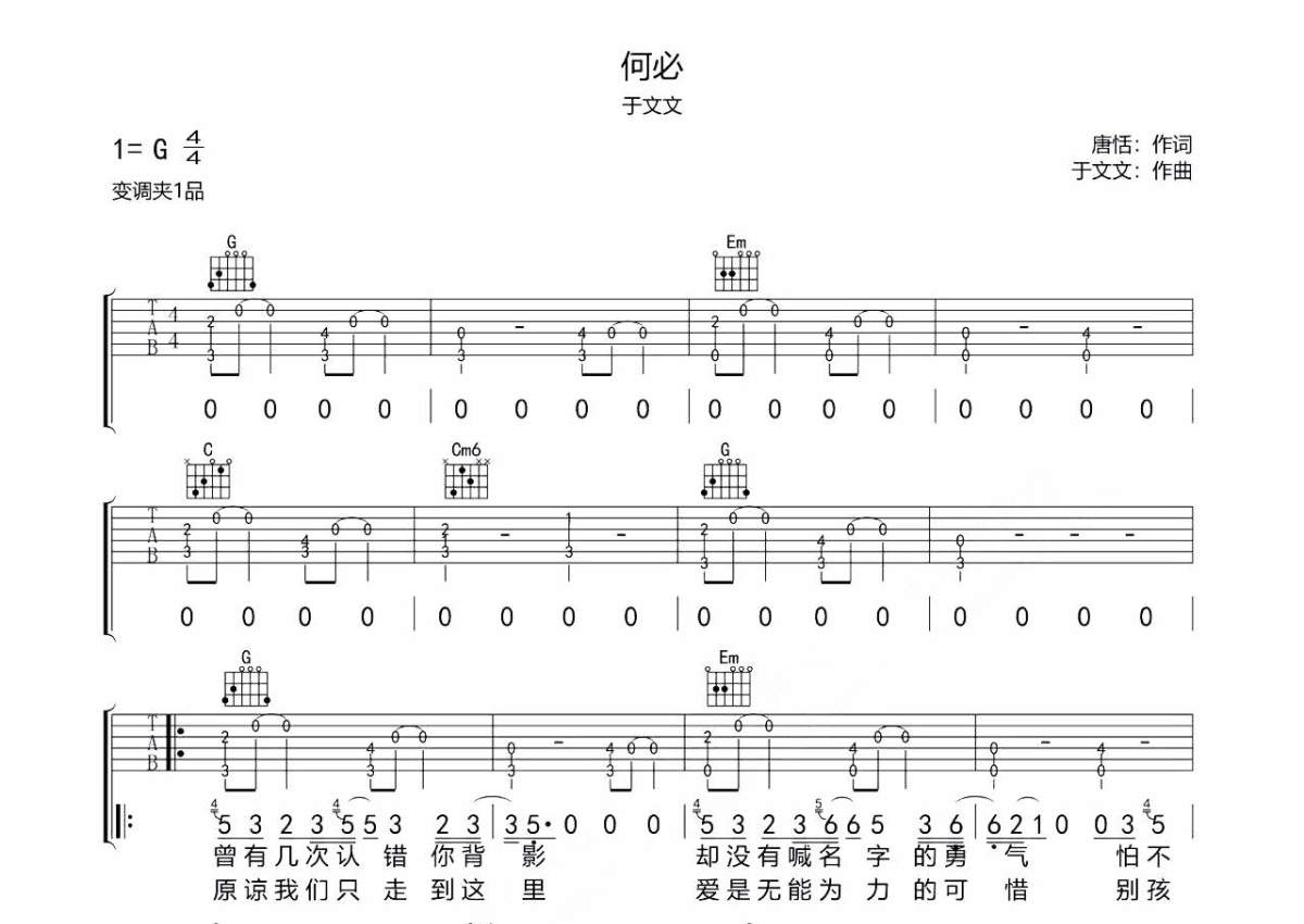 于文文《何必》吉他谱 - G调弹唱六线谱