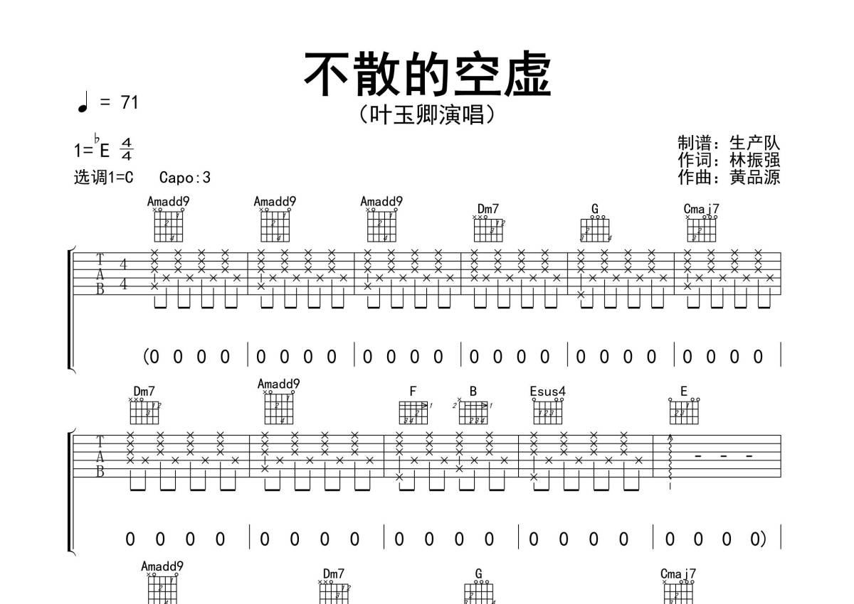 《不散的空虚》是叶玉卿演唱的一首歌曲,精编完美版,拍号为4/4拍,歌曲速度为每分钟71拍,歌曲原调为Eb调,但由于原调指法比较难,为了方便弹奏,本吉他谱采用的是C调指法编配,变调夹3品弹奏即为原调,当然也可以根据自己的音域改变变调夹位置,或者通过改变和弦调性,以方便自己弹奏,这份吉他谱共有三张高清图谱,图谱由 @生产队 编配上传,图谱使用六线谱编配,包含吉他和弦指法、简谱以及歌词部分,使用这份不散的空虚吉他谱,可以让你更加方便地掌握这首歌曲的弹唱技巧,快来尝试吧。《不散的空虚》是叶玉卿演出歌曲,1992年发行,收录于《挡不住的风情》专辑。本吉他谱根据原版采用C调指法编配,包含前奏、间奏solo,谱中Amadd9和弦有困难的朋友可以用Am和弦代替。值得推荐学习的粤语经典歌曲!。