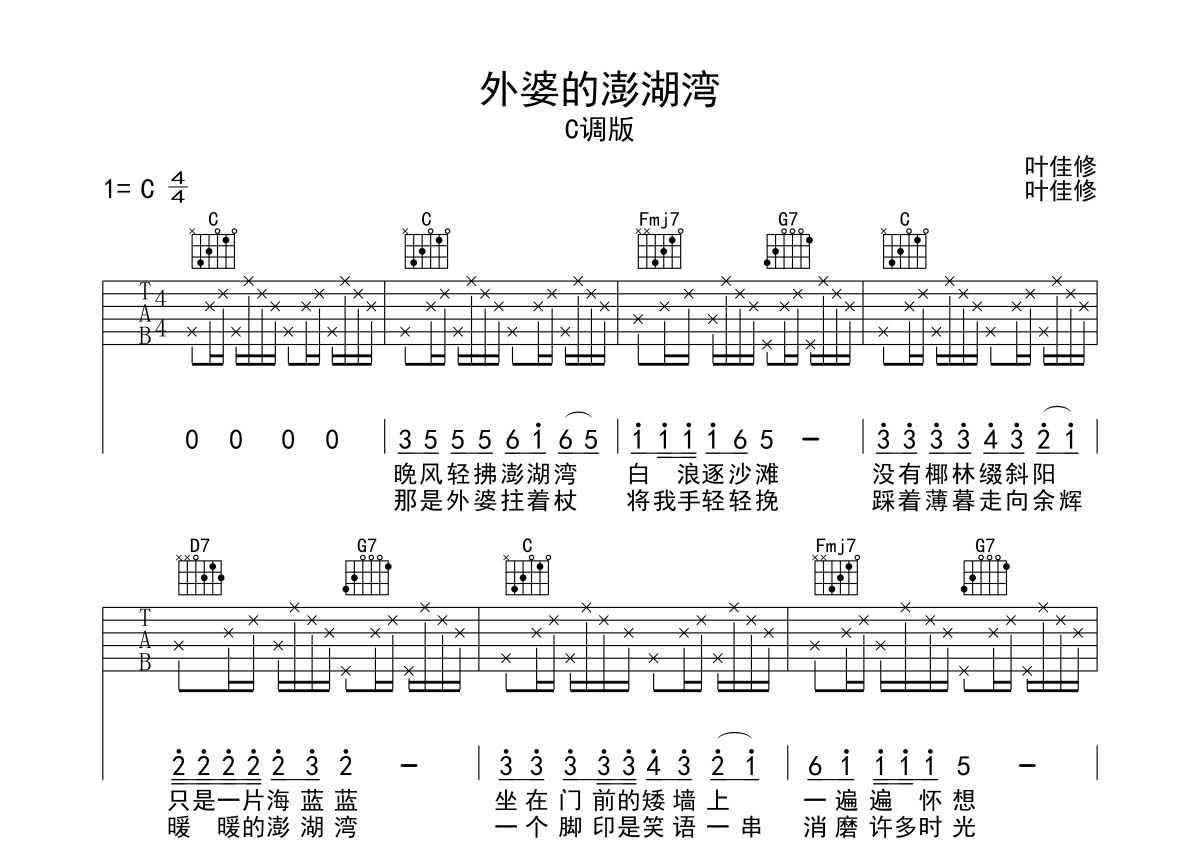 叶佳修《外婆的澎湖湾》吉他谱 - C调弹唱六线谱