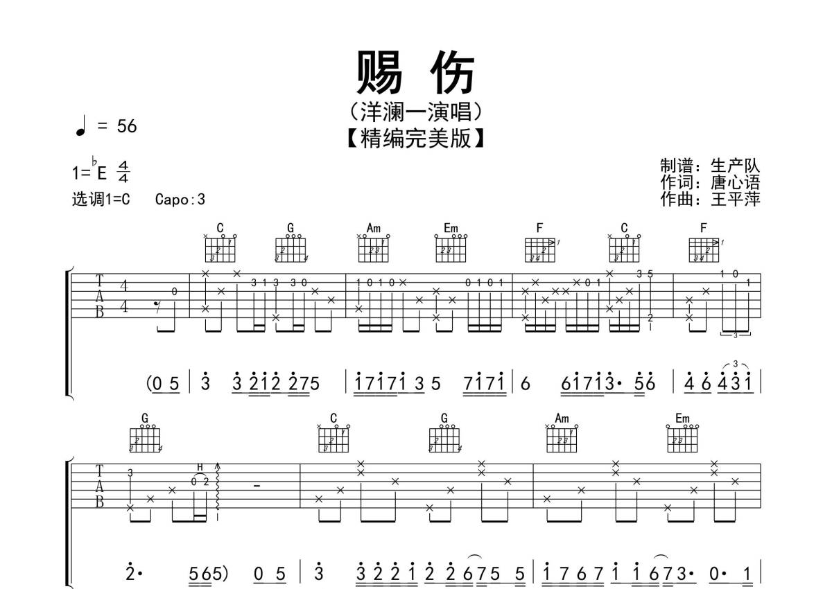 《赐伤》是洋澜一演唱的一首歌曲,精编完美版,拍号为4/4拍,歌曲速度为每分钟56拍,歌曲原调为Eb调,但由于原调指法比较难,为了方便弹奏,本吉他谱采用的是C调指法编配,变调夹3品弹奏即为原调,当然也可以根据自己的音域改变变调夹位置,或者通过改变和弦调性,以方便自己弹奏,这份吉他谱共有三张高清图谱,图谱由 @生产队 编配上传,图谱使用六线谱编配,包含吉他和弦指法、简谱以及歌词部分,使用这份赐伤吉他谱,可以让你更加方便地掌握这首歌曲的弹唱技巧,快来尝试吧。《赐伤》是由歌手洋澜一2023年演唱的歌曲。本吉他谱根据原版采用C调指法编配,完整的前奏、间奏、尾奏及solo编配,值得推荐的一首伤感情歌!。