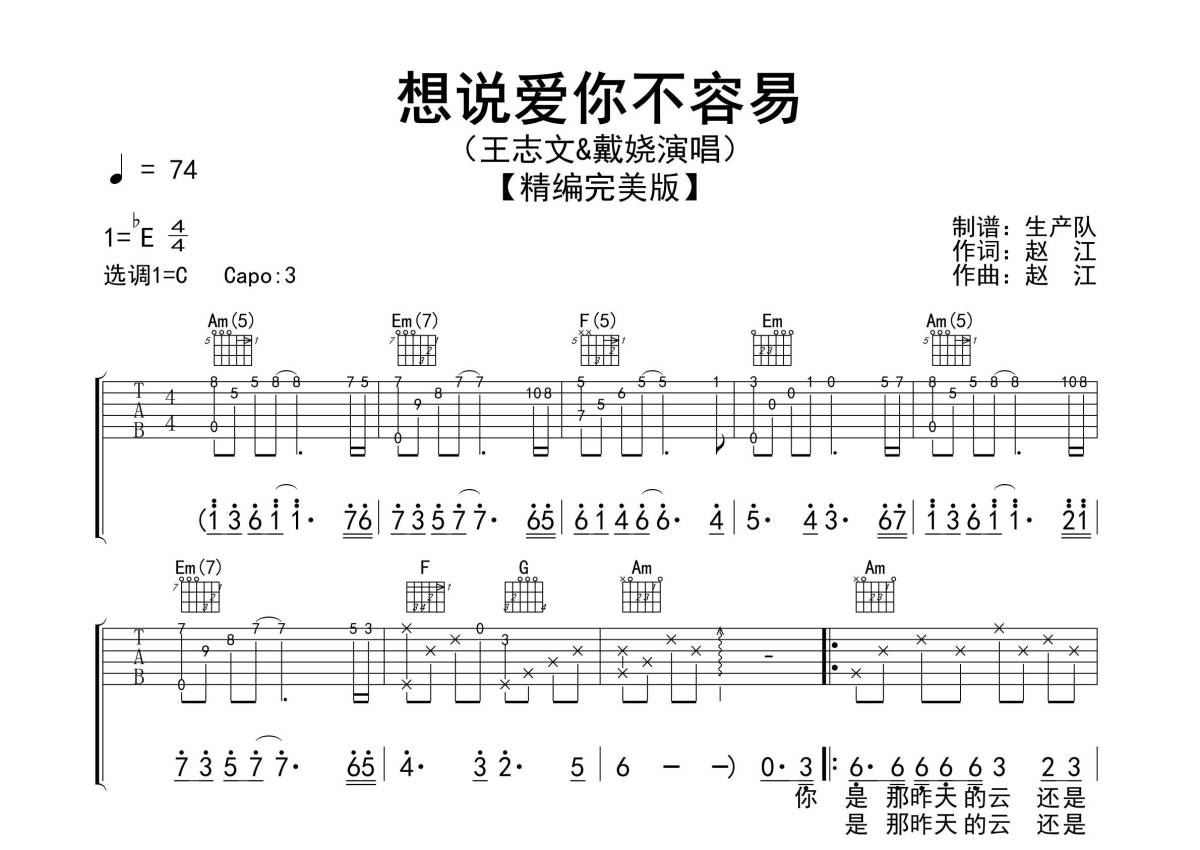 《想说爱你不容易》是王志文&戴娆演唱的一首歌曲,精编完美版,拍号为4/4拍,歌曲速度为每分钟74拍,歌曲原调为Eb调,但由于原调指法比较难,为了方便弹奏,本吉他谱采用的是C调指法编配,变调夹3品弹奏即为原调,当然也可以根据自己的音域改变变调夹位置,或者通过改变和弦调性,以方便自己弹奏,这份吉他谱共有三张高清图谱,图谱由 @生产队 编配上传,图谱使用六线谱编配,包含吉他和弦指法、简谱以及歌词部分,使用这份想说爱你不容易吉他谱,可以让你更加方便地掌握这首歌曲的弹唱技巧,快来尝试吧。《想说爱你不容易》是王志文和戴娆演唱的一首歌曲,同时也是1994年热映的新加坡电视剧《勇者无惧》的片头曲,收录在同名专辑《想说爱你不容易》中。本吉他谱根据原版采用C调指法编配,精准的前奏、SOLO、独白及伴奏节奏编配,值得推荐的怀旧经典歌曲!。