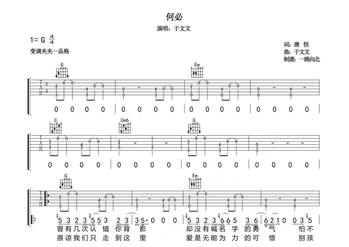 于文文《何必》吉他谱 - G调弹唱六线谱 - 专辑原版