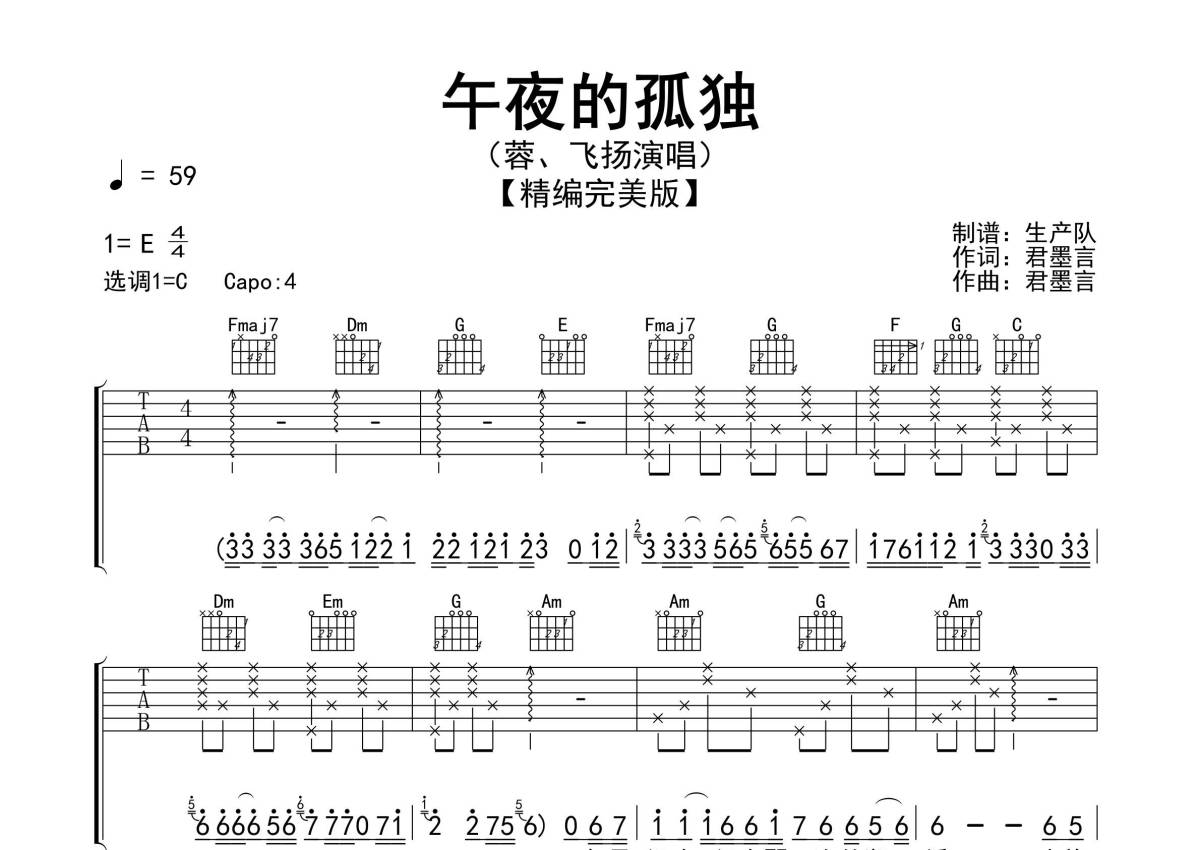 《午夜的孤独》是蓉丶飞扬演唱的一首歌曲,精编完美版,拍号为4/4拍,歌曲速度为每分钟59拍,歌曲原调为E调,但由于原调指法比较难,为了方便弹奏,本吉他谱采用的是C调指法编配,变调夹4品弹奏即为原调,当然也可以根据自己的音域改变变调夹位置,或者通过改变和弦调性,以方便自己弹奏,这份吉他谱共有三张高清图谱,图谱由 @生产队 编配上传,图谱使用六线谱编配,包含吉他和弦指法、简谱以及歌词部分,使用这份午夜的孤独吉他谱,可以让你更加方便地掌握这首歌曲的弹唱技巧,快来尝试吧。《午夜的孤独》是由蓉丶飞扬 演唱的一首伤感情歌。本吉他谱根据原版采用C调指法编配,精准的前奏、间奏、尾奏及SOLO编配,一音不差版,注意体会各种节奏型的递进效果,值得推荐学习的情歌!。