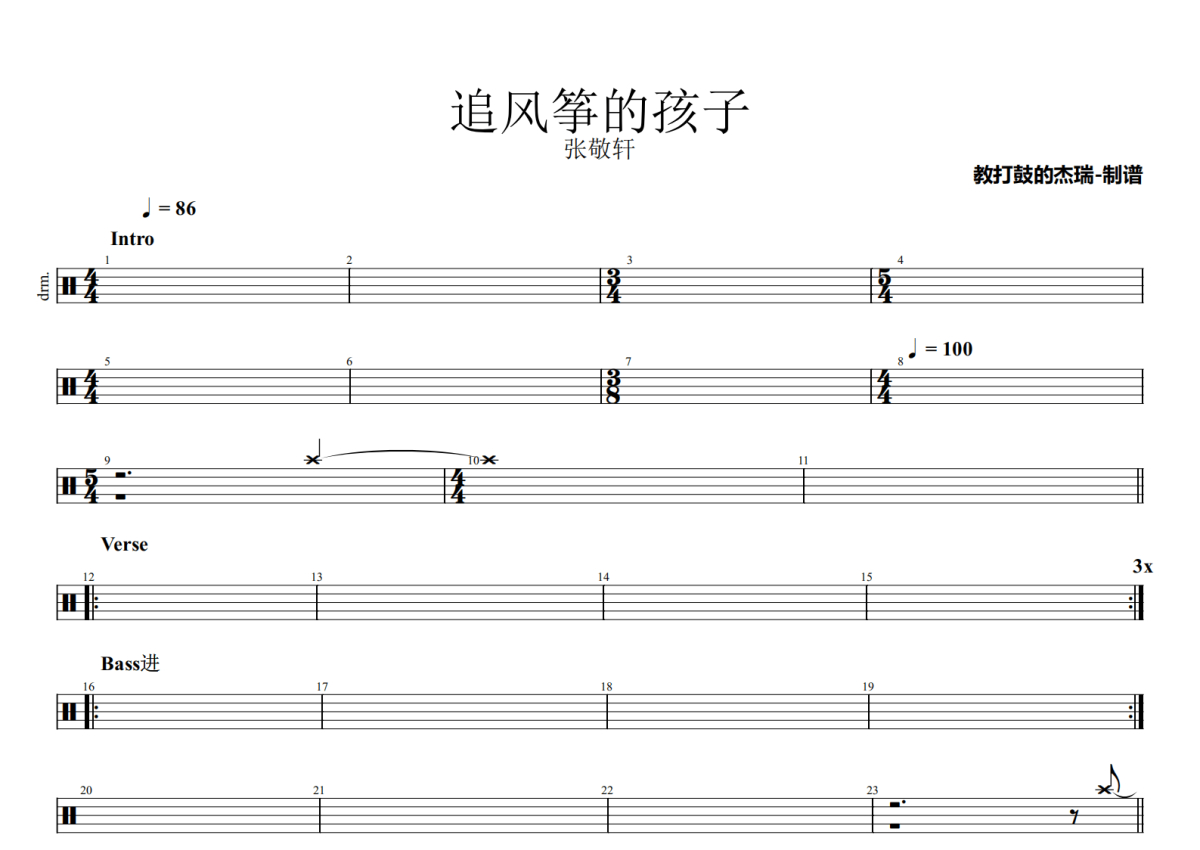 张敬轩《追风筝的孩子》鼓谱 - 架子鼓谱