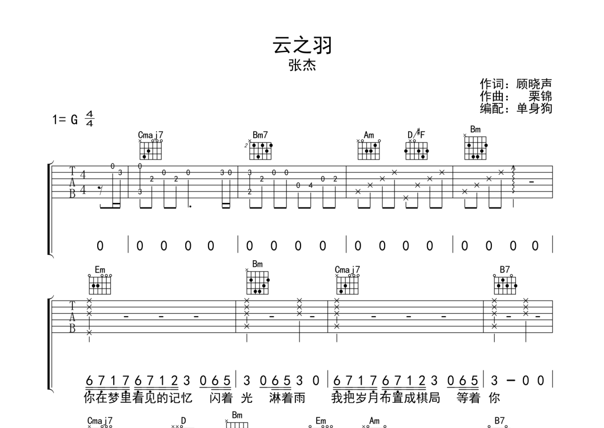 《云之羽》是张杰演唱的一首歌曲,拍号为4/4拍,歌曲原调为G调,本吉他谱采用的是G调指法编配,演奏时不需要使用变调夹即为原调,这份吉他谱共有三张高清图谱,图谱由 @单身狗 编配上传,图谱使用六线谱编配,包含吉他和弦指法、简谱以及歌词部分,使用这份云之羽吉他谱,可以让你更加方便地掌握这首歌曲的弹唱技巧,快来尝试吧。