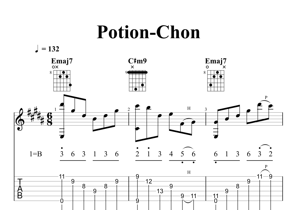 《Potion》是Chon演唱的一首歌曲,石头音乐原版记谱,拍号为6/8拍,歌曲速度为每分钟132拍,歌曲原调为B调,演奏时不需要使用变调夹即为原调,这份电吉他谱共有五张高清图谱,图谱由 @石头音乐 编配上传,图谱使用六线谱编配,曲谱配备了相关的音频提供试听,使用这份Potion电吉他谱,可以让你更加方便地掌握这首歌曲的演奏技巧,快来尝试吧。