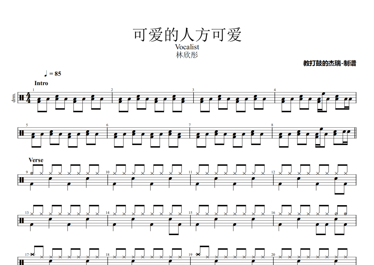 《可爱的人方可爱》是林欣彤演唱的一首歌曲,拍号为4/4拍,歌曲速度为每分钟85拍,这份鼓谱共有三张高清图谱,图谱由 @Jerry 编配上传,图谱使用五线谱编配,使用这份可爱的人方可爱架子鼓谱,你将能够轻松地敲打出这首林欣彤的可爱的人方可爱,快来尝试吧。