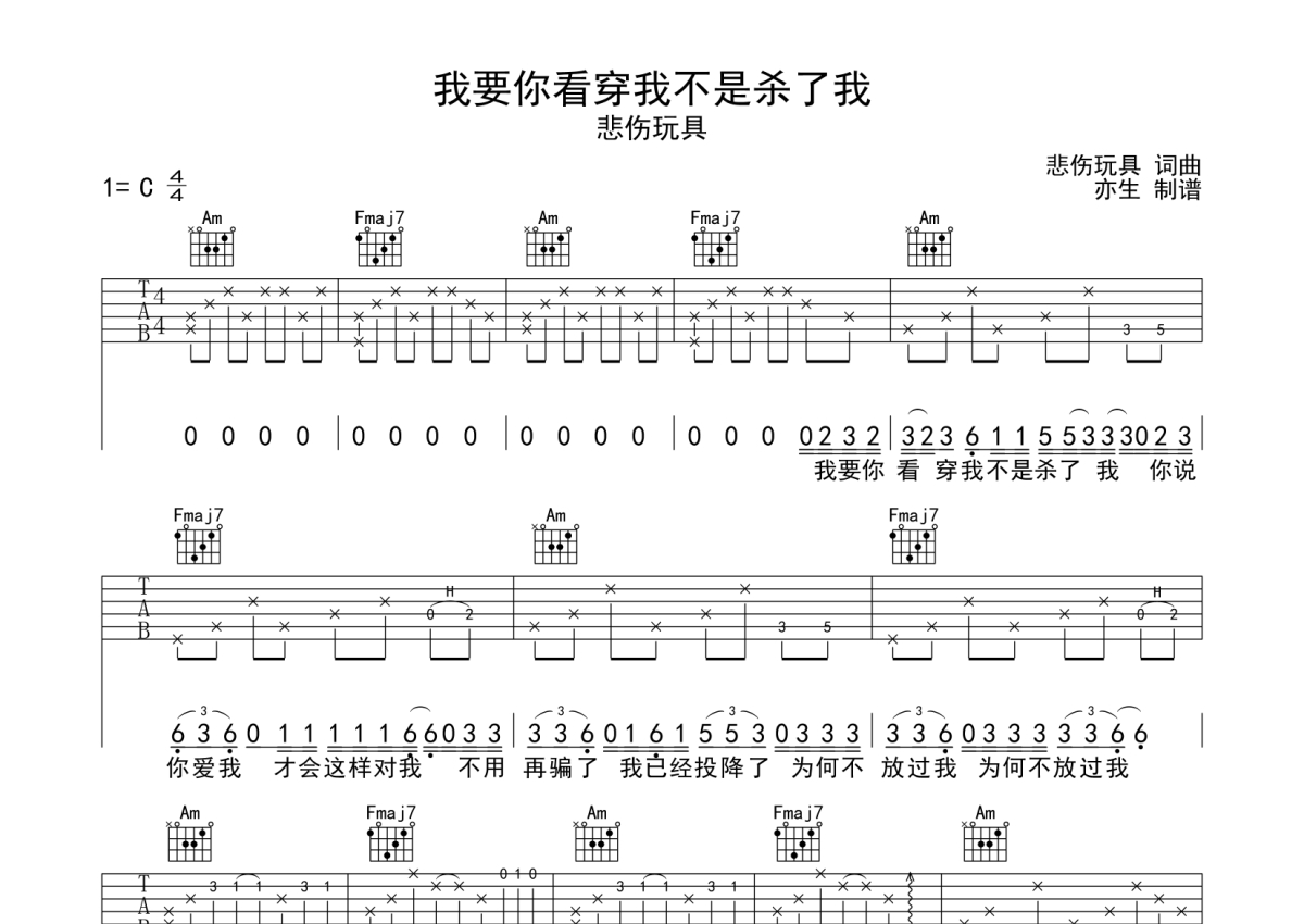 悲伤玩具《我要你看穿我不是杀了我》吉他谱 - C调弹唱六线谱