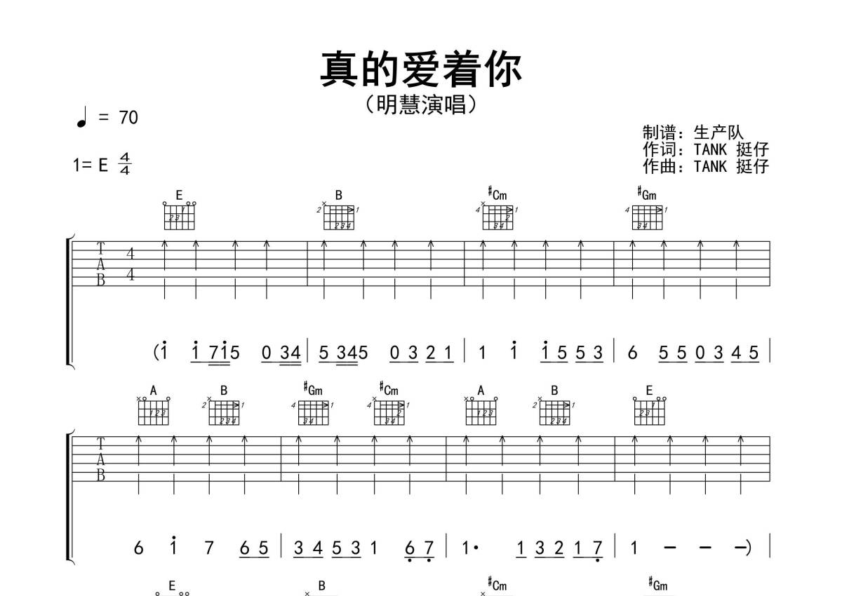 《真的爱着你》是明慧演唱的一首歌曲,明慧版,拍号为4/4拍,歌曲原调为E调,但由于原调指法比较难,为了方便弹奏,本吉他谱采用的是E调指法编配,演奏时不需要使用变调夹即为原调,这份吉他谱共有三张高清图谱,图谱由 @生产队 编配上传,图谱使用六线谱编配,包含吉他和弦指法、简谱以及歌词部分,使用这份真的爱着你吉他谱,可以让你更加方便地掌握这首歌曲的弹唱技巧,快来尝试吧。《真的爱着你》是TANK挺仔作词、作曲,明慧翻唱的一首粤语歌曲。本吉他谱根据原版E调指法编配,扫弦节奏,完整的前奏、间奏、尾奏及SOLO编配,值得推荐的怀旧粤语经典歌曲!。