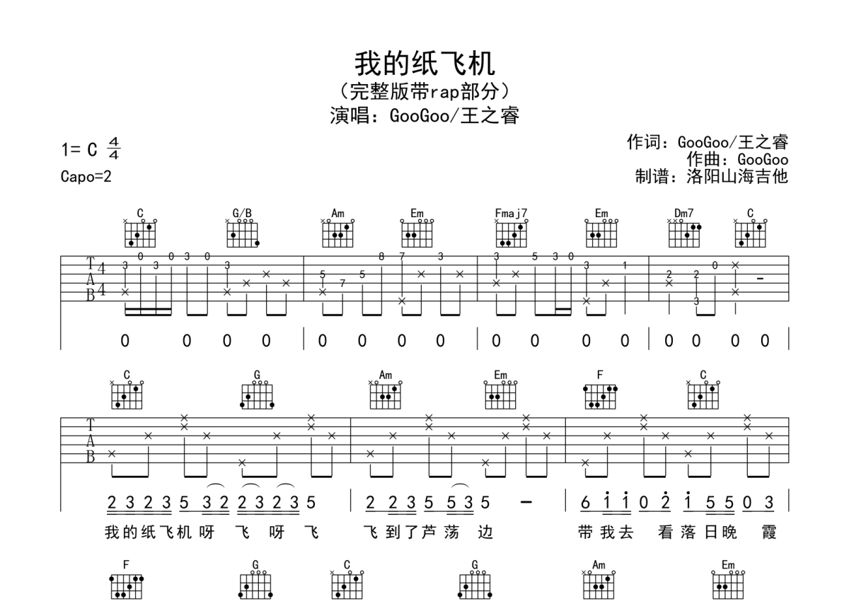 GooGoo/王之睿《我的纸飞机》吉他谱 - C调弹唱六线谱