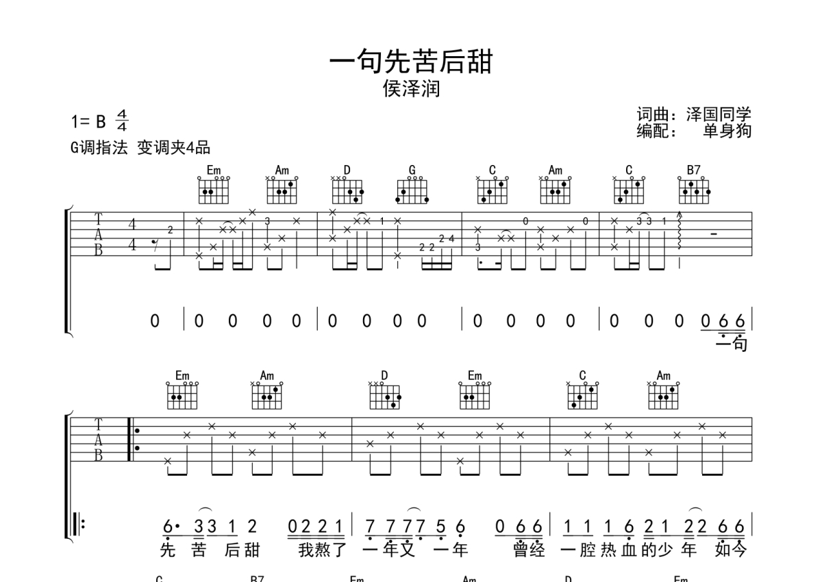 侯泽润《一句先苦后甜》吉他谱 - G调弹唱六线谱
