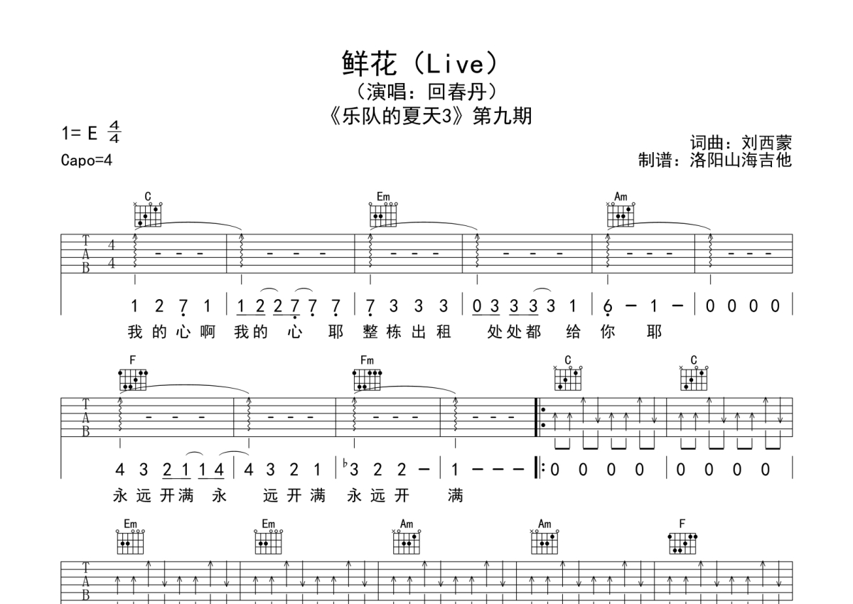 回春丹《鲜花》吉他谱 - C调弹唱六线谱 - 现场版