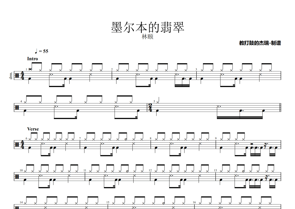 《墨尔本的翡翠》是林颐演唱的一首歌曲,拍号为4/4拍,歌曲速度为每分钟55拍,这份鼓谱共有两张高清图谱,图谱由 @Jerry 编配上传,图谱使用五线谱编配,使用这份墨尔本的翡翠架子鼓谱,你将能够轻松地敲打出这首林颐的墨尔本的翡翠,快来尝试吧。