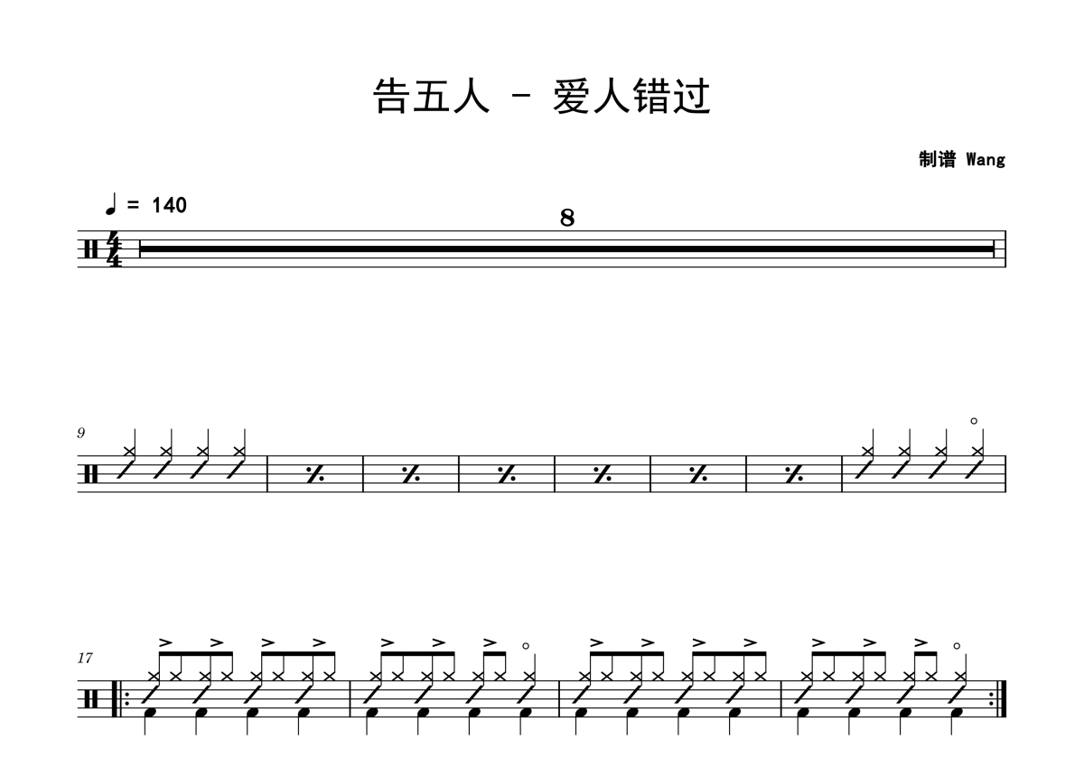 《爱人错过》是告五人演唱的一首歌曲,拍号为4/4拍,歌曲速度为每分钟140拍,这份鼓谱共有三张高清图谱,图谱由 @老虎不说谎 编配上传,图谱使用五线谱编配,使用这份爱人错过架子鼓谱,你将能够轻松地敲打出这首告五人的爱人错过,快来尝试吧。