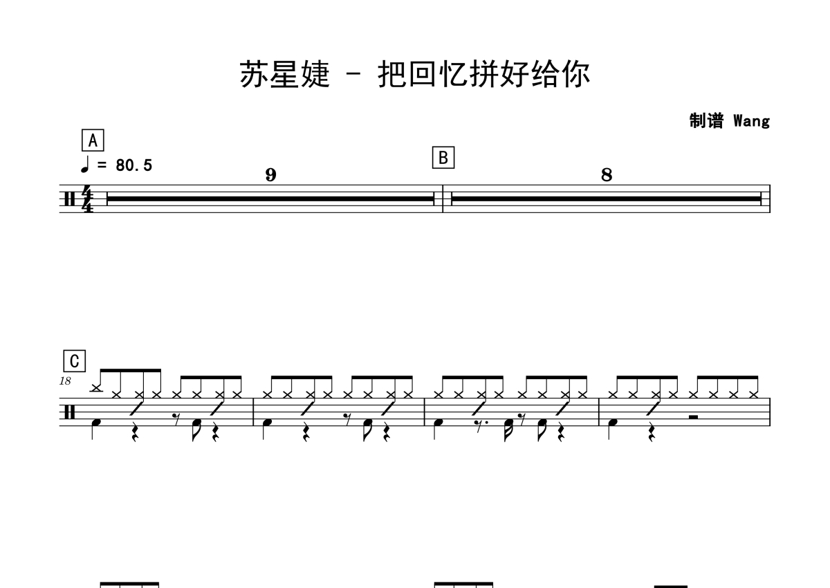 《把回忆拼好给你》是苏星婕演唱的一首歌曲,拍号为4/4拍,歌曲速度为每分钟80拍,这份鼓谱共有两张高清图谱,图谱由 @老虎不说谎 编配上传,图谱使用五线谱编配,使用这份把回忆拼好给你架子鼓谱,你将能够轻松地敲打出这首苏星婕的把回忆拼好给你,快来尝试吧。