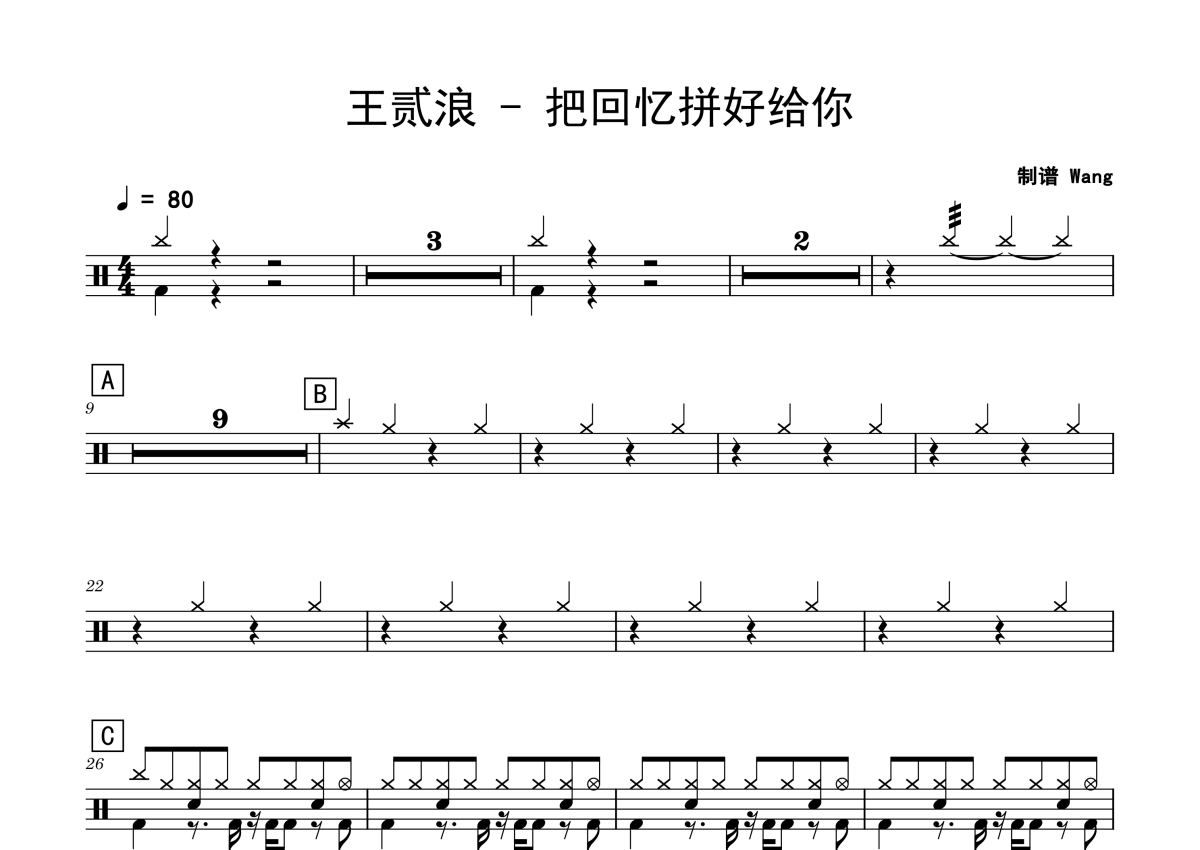 《把回忆拼好给你》是王贰浪演唱的一首歌曲,拍号为4/4拍,歌曲速度为每分钟80拍,这份鼓谱共有三张高清图谱,图谱由 @老虎不说谎 编配上传,图谱使用五线谱编配,使用这份把回忆拼好给你架子鼓谱,你将能够轻松地敲打出这首王贰浪的把回忆拼好给你,快来尝试吧。
