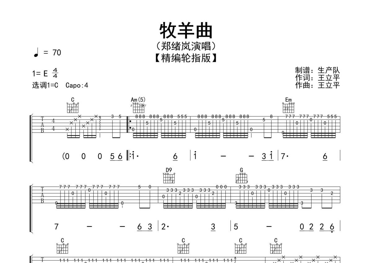 《牧羊曲》是郑绪岚演唱的一首歌曲,精编轮指版,拍号为4/4拍,歌曲速度为每分钟70拍,歌曲原调为E调,但由于原调指法比较难,为了方便弹奏,本吉他谱采用的是C调指法编配,变调夹4品弹奏即为原调,当然也可以根据自己的音域改变变调夹位置,或者通过改变和弦调性,以方便自己弹奏,这份吉他谱共有两张高清图谱,图谱由 @生产队 编配上传,图谱使用六线谱编配,包含吉他和弦指法、简谱以及歌词部分,使用这份牧羊曲吉他谱,可以让你更加方便地掌握这首歌曲的弹唱技巧,快来尝试吧。《牧羊曲》是郑绪岚演唱的歌曲,亦是电影《少林寺》的插曲,由王立平创作词曲,收录于专辑《郑绪岚独唱歌曲选》。本吉他谱根据原版采用C调指法编配的轮指版,完整的前奏,间奏编配,值得推荐的怀旧经典歌曲!。