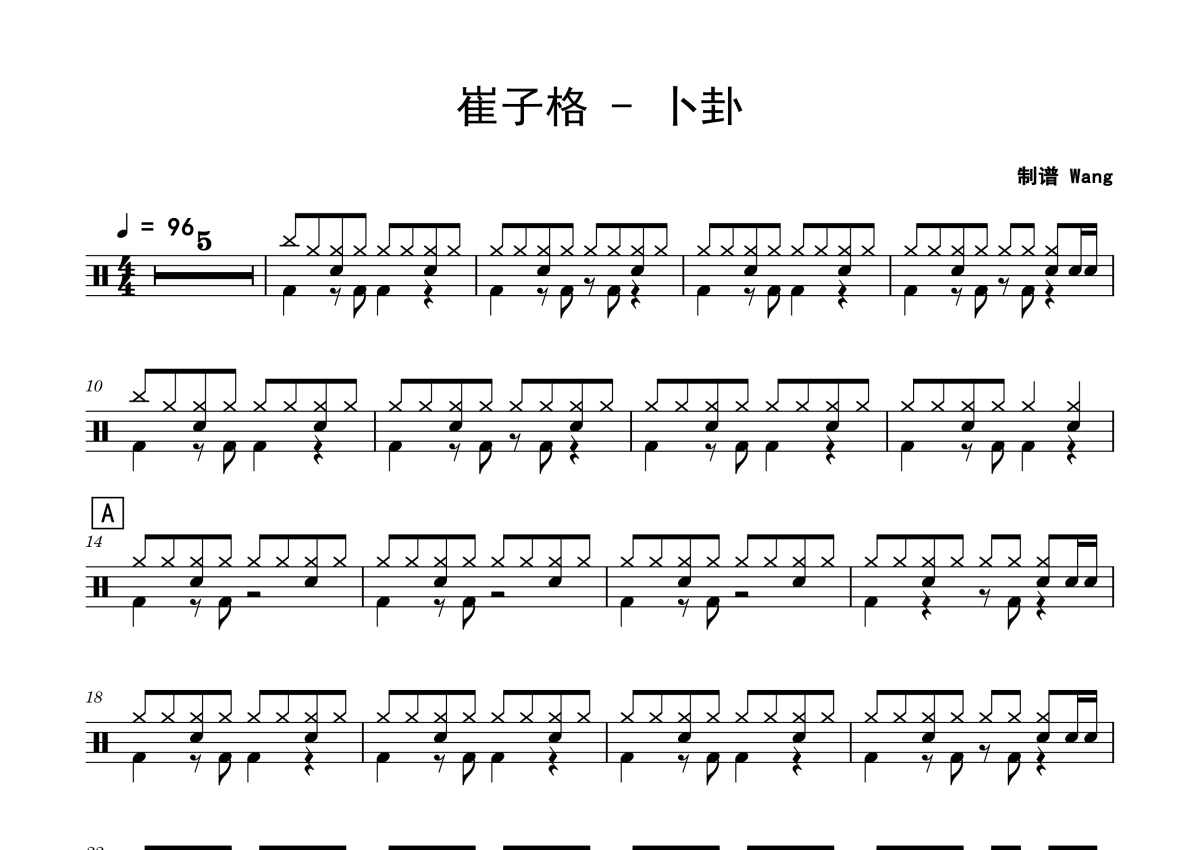 《卜卦》是崔子格演唱的一首歌曲,拍号为4/4拍,歌曲速度为每分钟96拍,这份鼓谱共有两张高清图谱,图谱由 @老虎不说谎 编配上传,图谱使用五线谱编配,使用这份卜卦架子鼓谱,你将能够轻松地敲打出这首崔子格的卜卦,快来尝试吧。