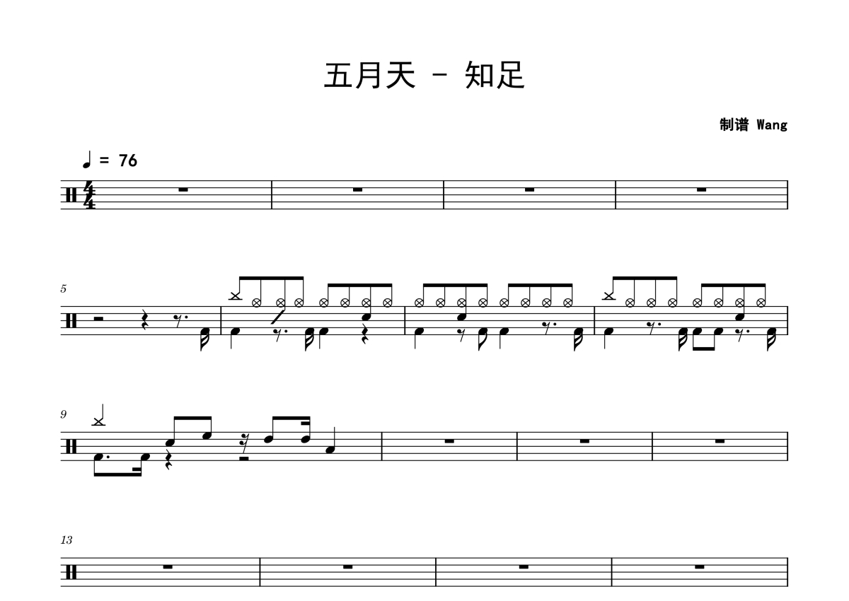 《知足》是五月天演唱的一首歌曲,拍号为4/4拍,歌曲速度为每分钟76拍,这份鼓谱共有三张高清图谱,图谱由 @老虎不说谎 编配上传,图谱使用五线谱编配,使用这份知足架子鼓谱,你将能够轻松地敲打出这首五月天的知足,快来尝试吧。