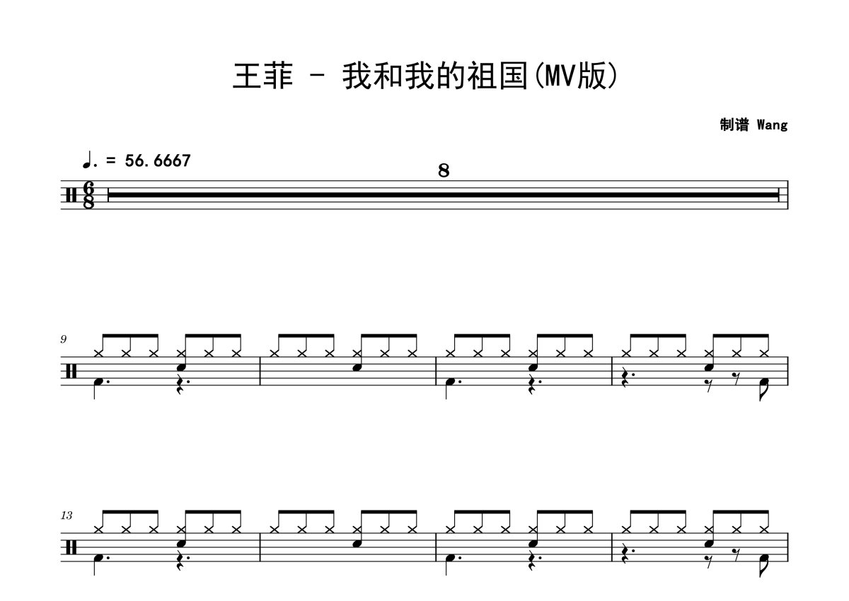 《我和我的祖国》是王菲演唱的一首歌曲,MV版,拍号为6/8拍,歌曲速度为每分钟56拍,这份鼓谱共有三张高清图谱,图谱由 @老虎不说谎 编配上传,图谱使用五线谱编配,使用这份我和我的祖国架子鼓谱,你将能够轻松地敲打出这首王菲的我和我的祖国,快来尝试吧。