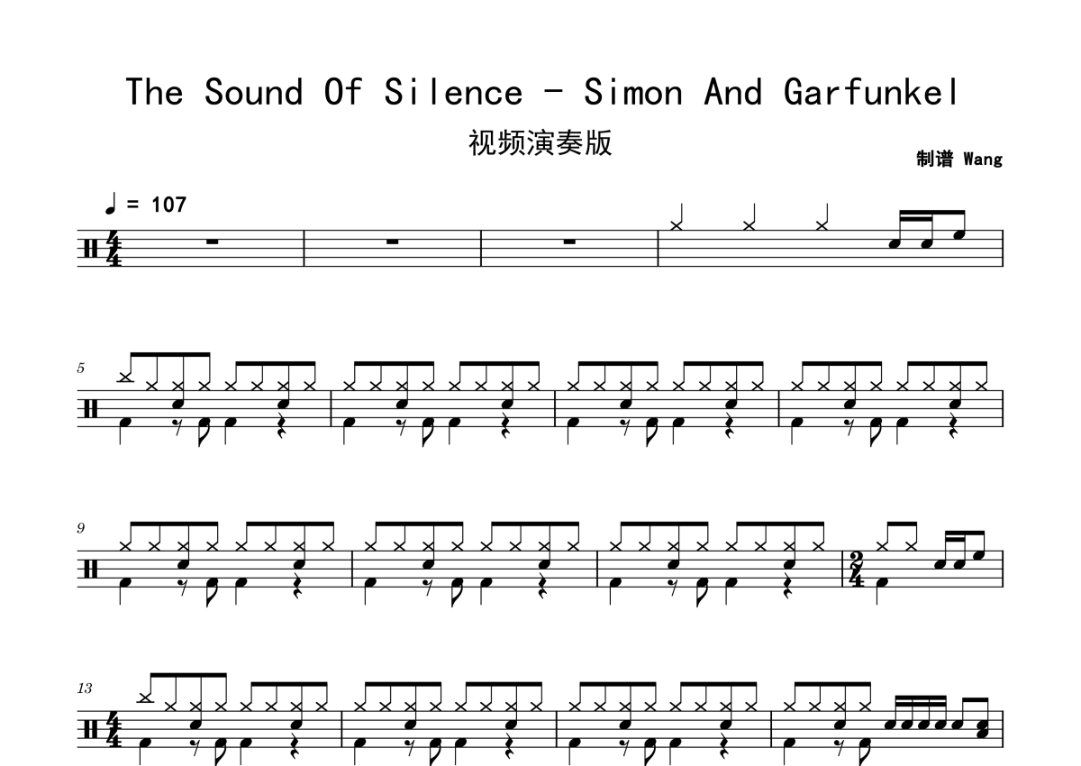 《The Sound Of Silence》是Simon And Garfunkel演唱的一首歌曲,拍号为4/4拍,歌曲速度为每分钟107拍,这份鼓谱共有两张高清图谱,图谱由 @老虎不说谎 编配上传,图谱使用五线谱编配,使用这份The Sound Of Silence架子鼓谱,你将能够轻松地敲打出这首Simon And Garfunkel的The Sound Of Silence,快来尝试吧。