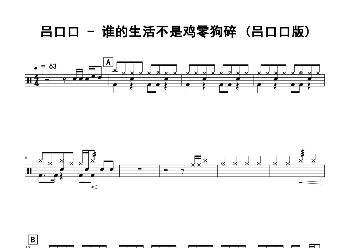 《谁的生活不是鸡零狗碎》是吕口口演唱的一首歌曲,拍号为4/4拍,歌曲速度为每分钟63拍,这份鼓谱共有两张高清图谱,图谱由 @老虎不说谎 编配上传,图谱使用五线谱编配,使用这份谁的生活不是鸡零狗碎架子鼓谱,你将能够轻松地敲打出这首吕口口的谁的生活不是鸡零狗碎,快来尝试吧。