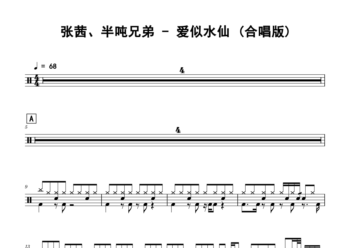 张茜/半吨兄弟《爱似水仙》鼓谱 - 架子鼓谱 - 合唱版