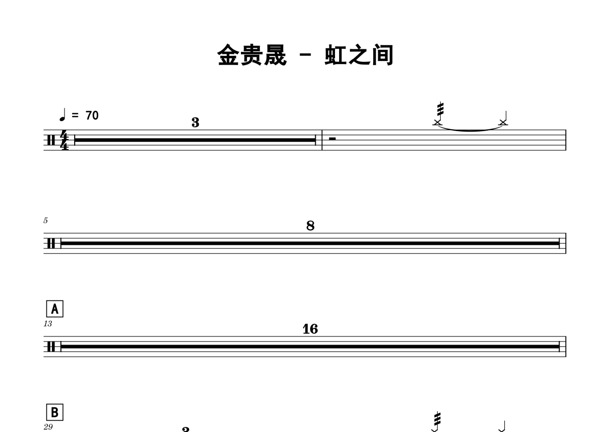 《虹之间》是金贵晟演唱的一首歌曲,拍号为4/4拍,歌曲速度为每分钟70拍,这份鼓谱共有两张高清图谱,图谱由 @老虎不说谎 编配上传,图谱使用五线谱编配,使用这份虹之间架子鼓谱,你将能够轻松地敲打出这首金贵晟的虹之间,快来尝试吧。