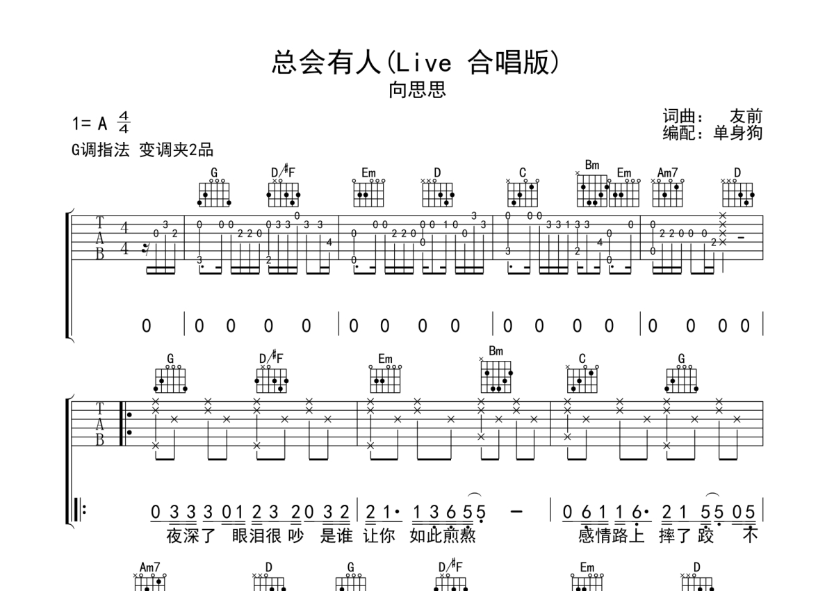 向思思《总会有人》吉他谱 - G调弹唱六线谱 - Live 合唱版
