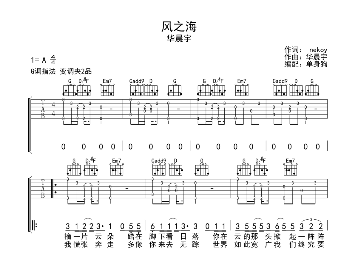 《风之海》是华晨宇演唱的一首歌曲,拍号为4/4拍,歌曲原调为A调,但由于原调指法比较难,为了方便弹奏,本吉他谱采用的是G调指法编配,变调夹2品弹奏即为原调,当然也可以根据自己的音域改变变调夹位置,或者通过改变和弦调性,以方便自己弹奏,这份吉他谱共有四张高清图谱,图谱由 @单身狗 编配上传,图谱使用六线谱编配,包含吉他和弦指法、简谱以及歌词部分,使用这份风之海吉他谱,可以让你更加方便地掌握这首歌曲的弹唱技巧,快来尝试吧。
