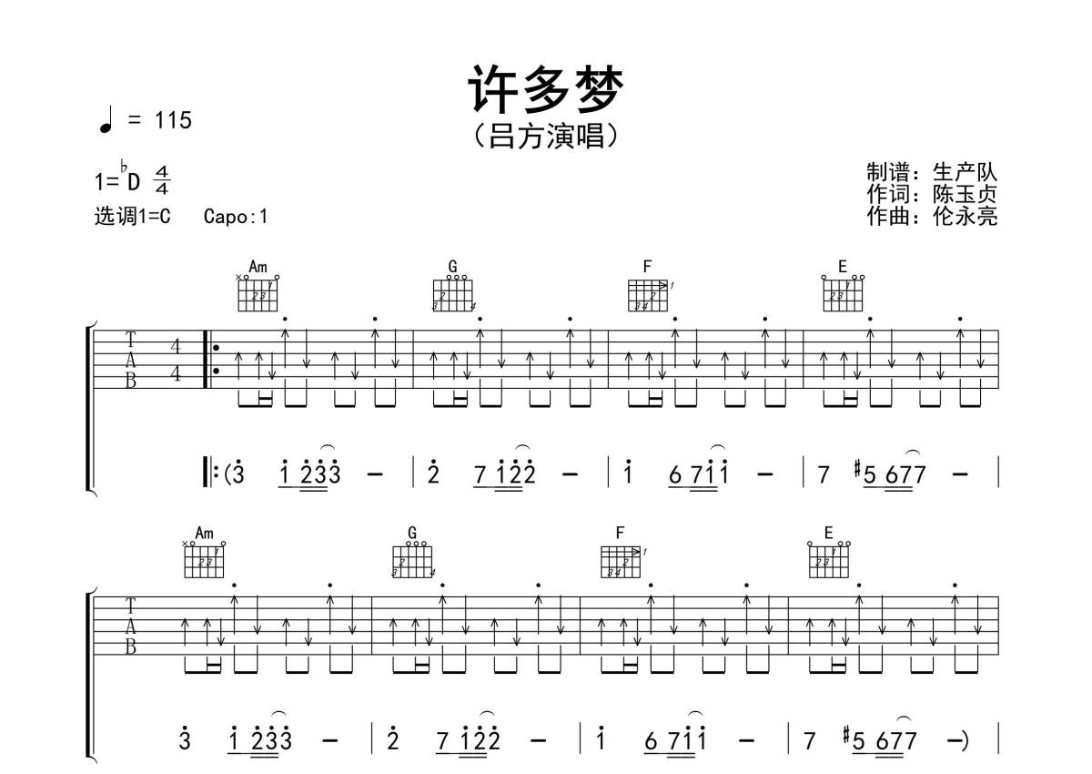 《许多梦》是吕方演唱的一首歌曲,精编扫弦版,拍号为4/4拍,歌曲速度为每分钟115拍,歌曲原调为Db调,但由于原调指法比较难,为了方便弹奏,本吉他谱采用的是C调指法编配,变调夹1品弹奏即为原调,当然也可以根据自己的音域改变变调夹位置,或者通过改变和弦调性,以方便自己弹奏,这份吉他谱共有三张高清图谱,图谱由 @生产队 编配上传,图谱使用六线谱编配,包含吉他和弦指法、简谱以及歌词部分,使用这份许多梦吉他谱,可以让你更加方便地掌握这首歌曲的弹唱技巧,快来尝试吧。《许多梦》是吕方演唱的歌曲,由陈玉贞作词,伦永亮作曲,收录于专辑《痴情小子》。本吉他谱根据采用C调指法编配,完整的前奏、间奏、尾奏及SOLO编配,动感十足的歌曲采用扫弦切音节奏效果很棒,值得推荐的怀旧经典歌曲!。