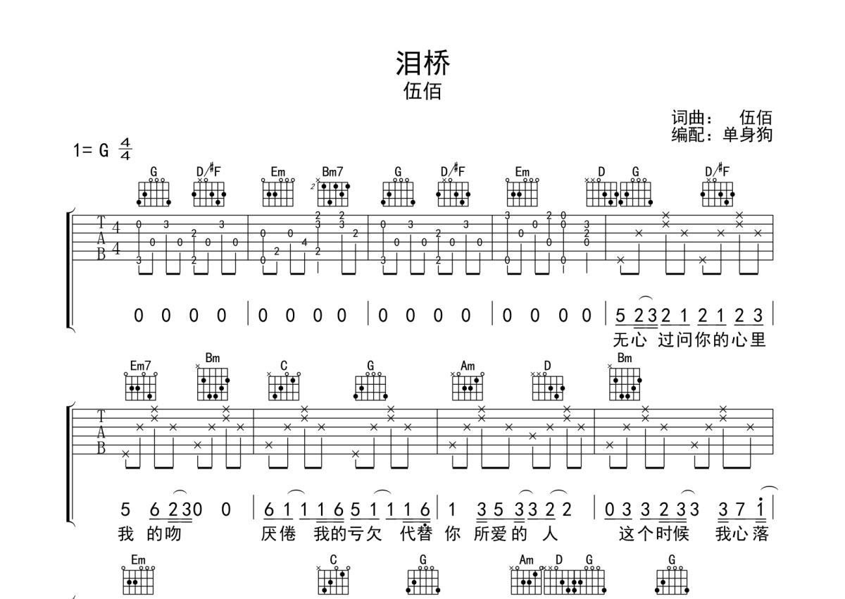 《泪桥》是伍佰演唱的一首歌曲,拍号为4/4拍,歌曲原调为G调,本吉他谱采用的是G调指法编配,演奏时不需要使用变调夹即为原调,这份吉他谱共有三张高清图谱,图谱由 @单身狗 编配上传,图谱使用六线谱编配,包含吉他和弦指法、简谱以及歌词部分,使用这份泪桥吉他谱,可以让你更加方便地掌握这首歌曲的弹唱技巧,快来尝试吧。