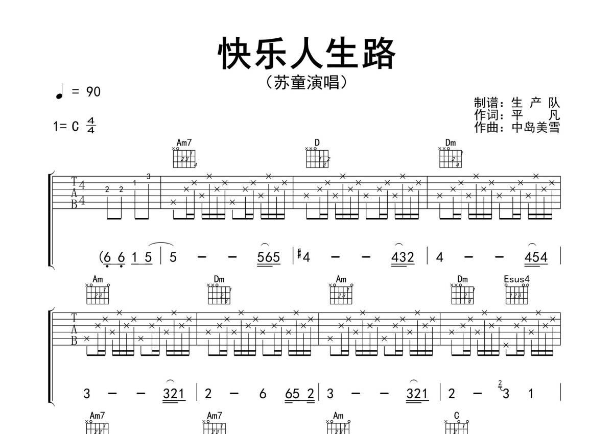 《快乐人生路》是苏童演唱的一首歌曲,精编完美版,拍号为4/4拍,歌曲速度为每分钟90拍,歌曲原调为C调,本吉他谱采用的是C调指法编配,演奏时不需要使用变调夹即为原调,这份吉他谱共有三张高清图谱,图谱由 @生产队 编配上传,图谱使用六线谱编配,包含吉他和弦指法、简谱以及歌词部分,使用这份快乐人生路吉他谱,可以让你更加方便地掌握这首歌曲的弹唱技巧,快来尝试吧。《快乐人生路》是由歌手苏童演唱的《漫步人生路》国语版,也是电视剧《缘来一家人》的插曲 。本吉他谱根据原版C调指法编配,精准的前奏、间奏、尾奏及SOLO编配,值得推荐的怀旧经典歌曲!。