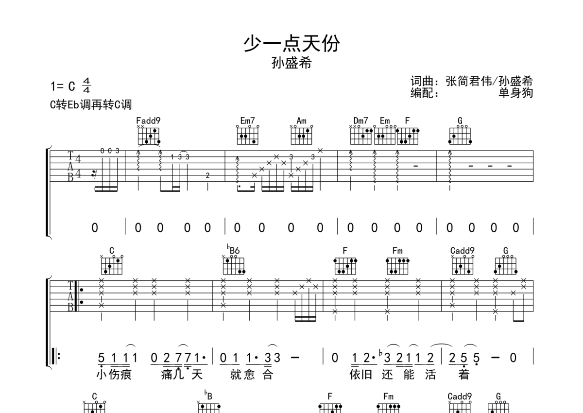 孙盛希《少一点天份》吉他谱 - C调弹唱六线谱