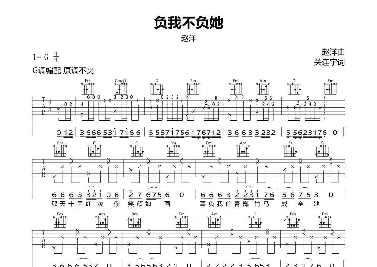 赵洋《负我不负她》吉他谱 - G调弹唱六线谱